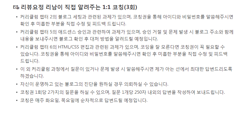 1:1 코칭권을 사용하면 내가 '리남'님의 강의를 보면서 막히는 부분이 있을때 다이렉트로 질문을 할 수 있어서 좋은 것 같습니다.