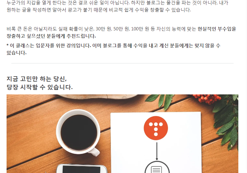 그런데 '수익형 블로그' 운영은 초기에 자본이 들어가는 것도 없고, 직장을 다니면서도 충분히 할 수 있을 것 같아서 신청하게 되었습니다.