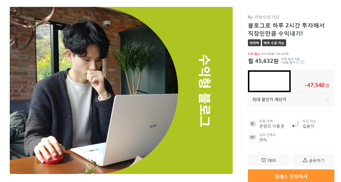 클래스 101에 '리뷰요정 리남'님의 수익형 블로그 강의 개설 소식을 접하고 신청하게 되었습니다.
