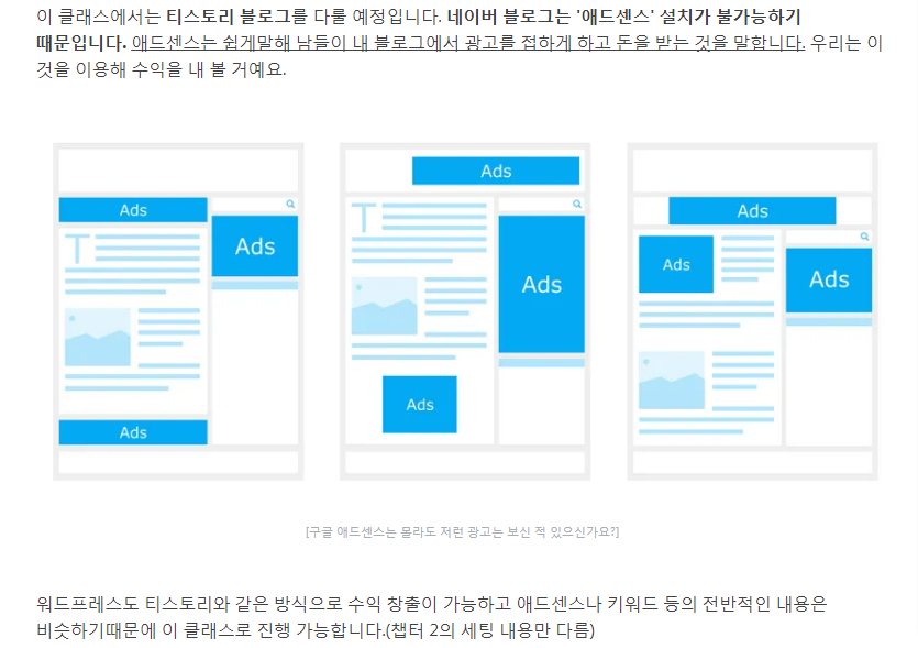 위 그림의 설명처럼 '워드프레스'에도 애드센스를 달 수 있기 때문에 상관 없습니다.
