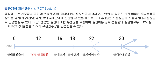 PCT출원에 따르면, 국내단계로 진입할 때까지의 기간이 우선일로부터 30개월까지 연장되는 효과가 있습니다.