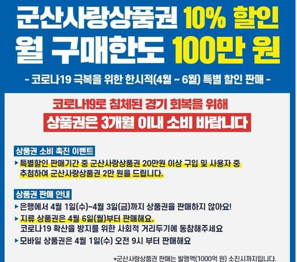 그래서, 군산사랑상품권 구매 시 10% 할인율을 도입하는 과감한 결정을 하였습니다.