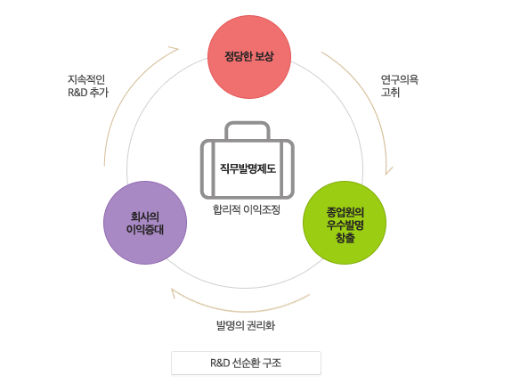 직무발명에 대한 정당한 보상을 주어 종업원의 기술개발 의욕을 고취시킬 수 있습니다.
