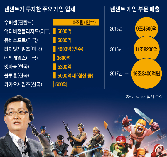 2015년에 온라인 게임인 리그오브레전드를 개발한 미국의 라이엇게임스를 인수한 데 이어 2016년에 모바일 게임업체인 핀란드의 슈퍼셀을 인수하면서 텐센트는 중국을 넘어 글로벌 최대 게임업체로 성장 했습니다.